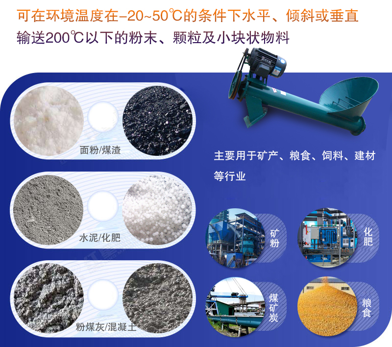 螺旋給料機主要用于礦產、糧食、飼料、建材等行業(yè),可在環(huán)境溫度在-20~50℃的條件下水平、傾斜或垂直輸送200℃以下的粉末、顆粒及小塊狀物料,如:面粉、煤渣、粉煤灰、化肥、水泥、混凝土等物料。