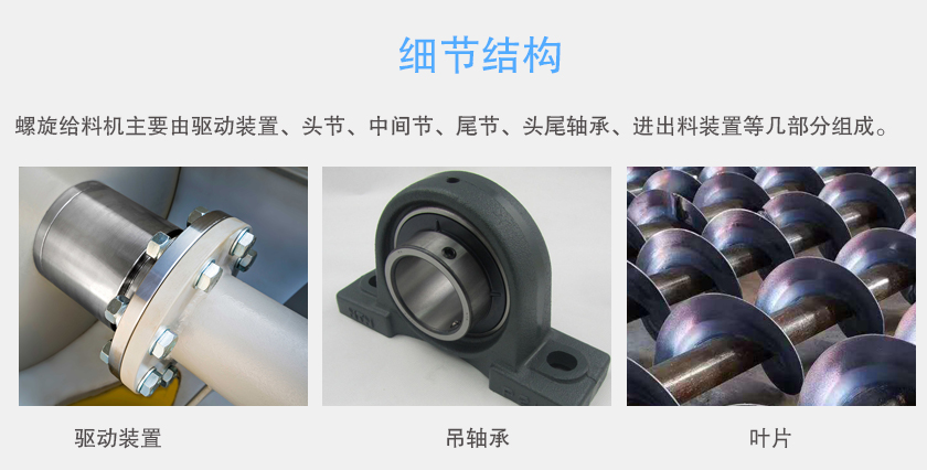 螺旋給料機主要由驅動裝置、頭節(jié)、中間節(jié)、尾節(jié)、頭尾軸承、進出料裝置等幾部分組成。